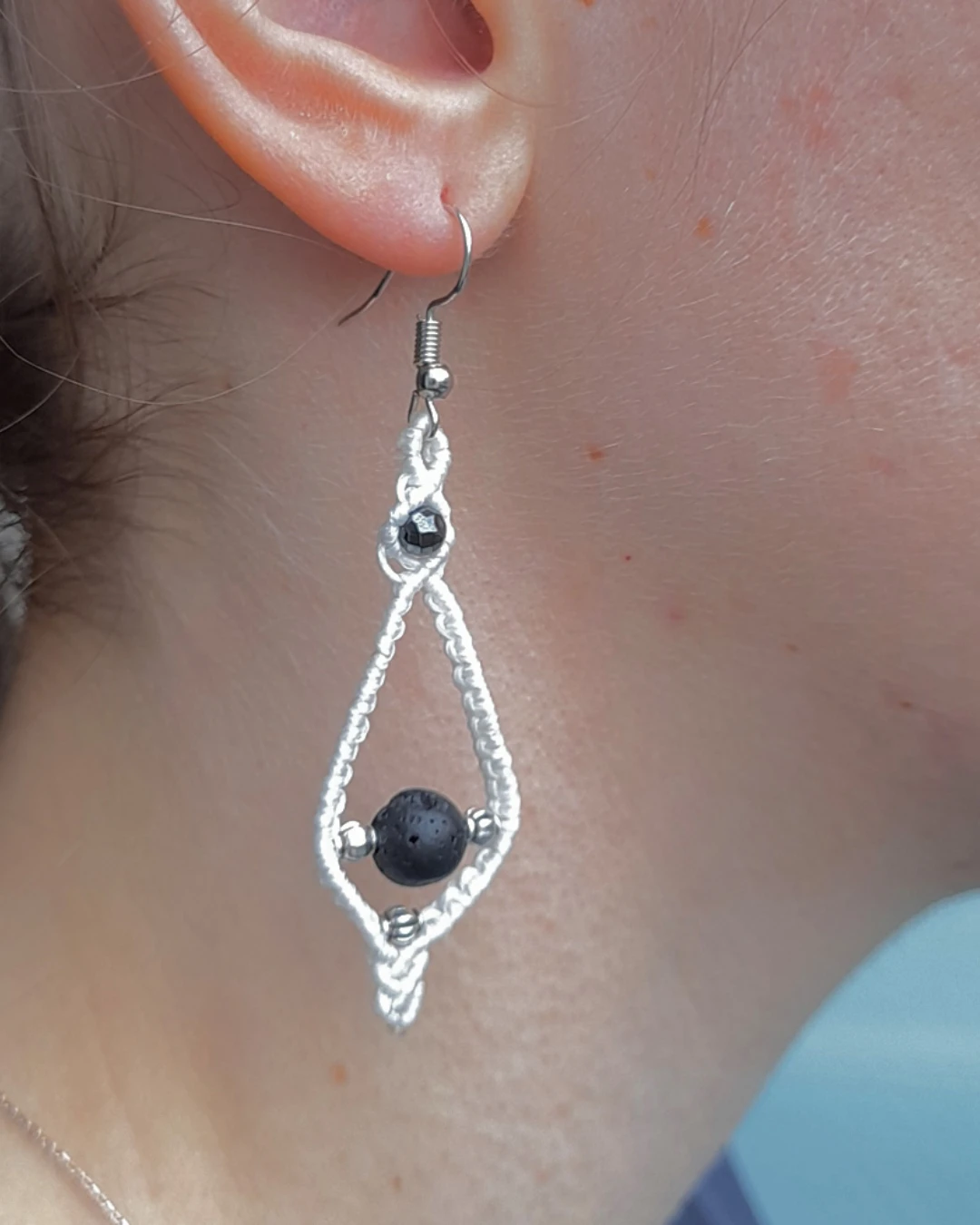 Σκουλαρίκια μακραμέ χειροποίητα “ρόμβος”! Σκουλαρίκια μακραμέ χειροποίητα με κερωμένο νήμα, επάργυρες ή επίχρυσες χάνδρες, αιματίτες και ηφαιστιακές λάβες. Το κούμπωμα ειναι ατσάλινο και υποαλλεργικό. Μήκος 7cm. πλάτος 2cm. Διατίθεται στους 3 χρωματισμούς που βλέπετε.