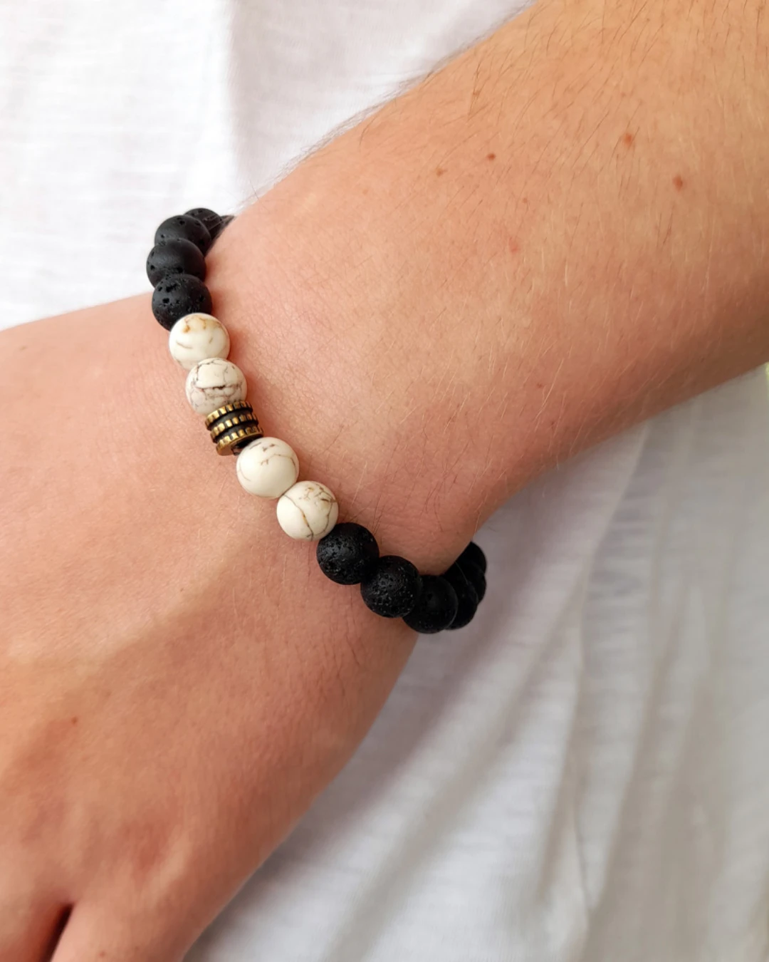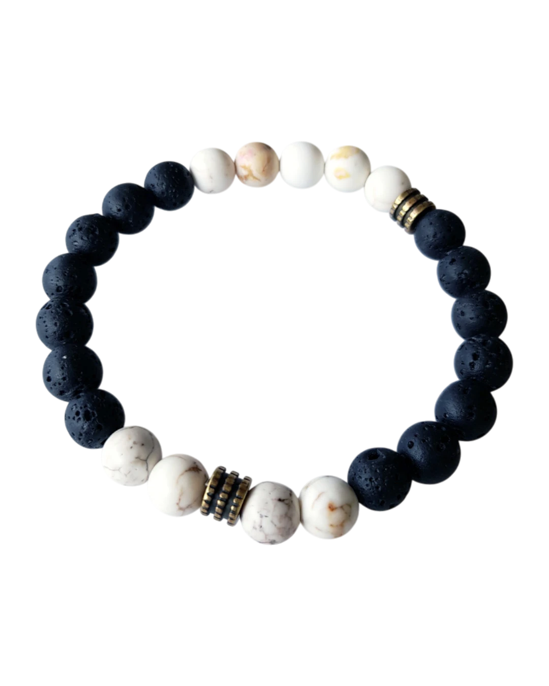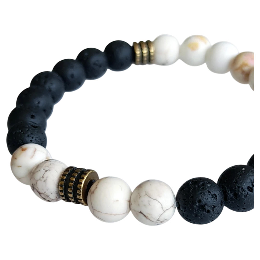 Βραχιόλι χειροποίητο Ανδρικό-unisex! Με ορυκτές πέτρες απο μαύρη λάβα, χάνδρες χαολίτη και μεταλλική ζάμακ χάνδρα σωληνάκι. Ελαστικό με σιλικόνη – stretch. Το μέγεθος καλύπτει καρπούς με διάμετρο απο 18 – 21cm.
