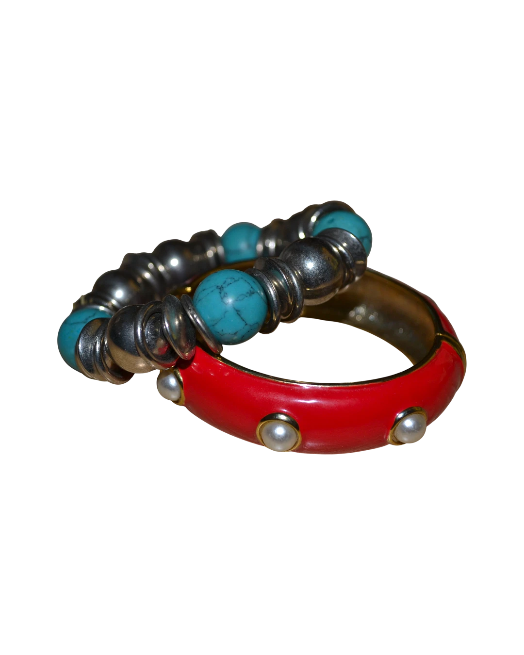 Βραχιόλια σέτ των 2 vintage! Με τις τυρκουάζ πέτρες ειναι stretch η χειροπέδα μέ κόκκινο σμάλτο και πέρλες ανοίγει – κλείνει μέ μηχανισμό.